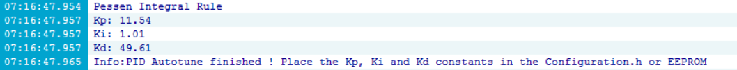 Após enviar esse comando a impressora vai aquecer e resfriar algumas vezes e vai retornar alguns valores de KP, KI e KD durante o processo. Deve-se aguardar até aparecer a mensagem "Info:PID Autotune finished ! Place the Kp, Ki and Kd constants in the Configuration.h or EEPROM" e após isso copie os valores de KP, KI e KD que devem ser preenchido nos campos do EEPROM da máquina.
